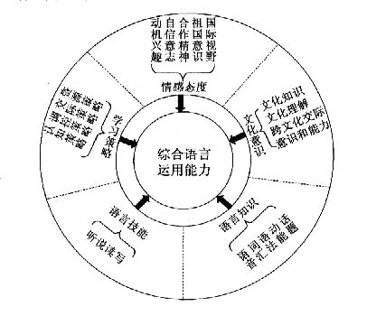 為了方便分析,我們先看一下新版普通高中《英語課程標準》的目標結(jié)構(gòu)圖。其中,“綜合語言運用能力”占據(jù)中心圓的位置,外圍分成五個扇形,分別為“語言技能、語言知識、情感態(tài)度、學習策略和文化意識”,它們分別指向中間的核心----綜合語言運用能力。