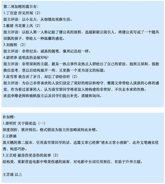 每次寫作活動之后,版主應瀏覽全班的文章,選出好文章加精,并注明加精理由。加精的理由可以較為寬泛,比如感情細膩、描寫優(yōu)美、題材新穎、見解獨到,或者只是非常有趣、值得記錄。任何認真寫作的文章——只要版主覺得值得肯定、值得鼓勵,都在選擇范圍之內(nèi)。